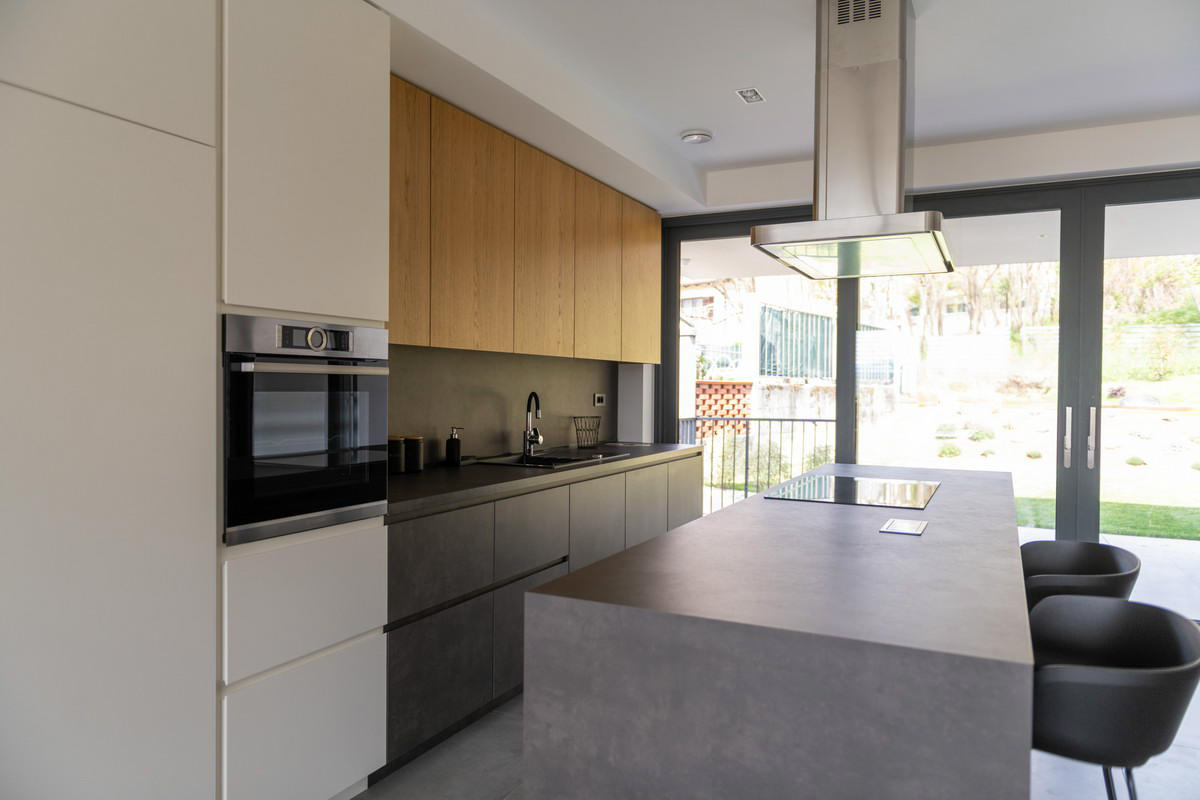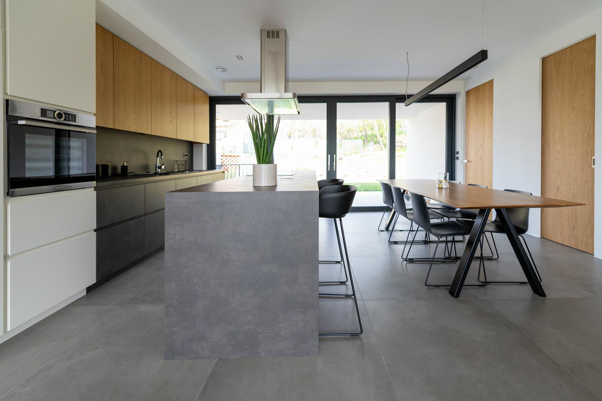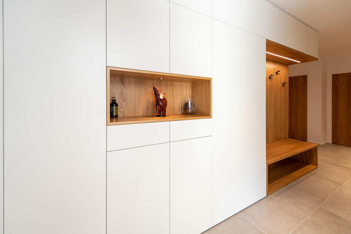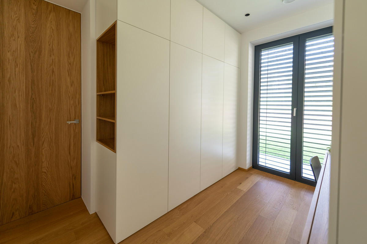 In the kitchen, the combination of dark ultrapas, white-painted MDF and lacquered oak veneer is enriched by the most modern fittings and hidden ways of opening doors and drawers. In the dining room there is a table made of solid oak wood. White and oak are the red thread of all other rooms.