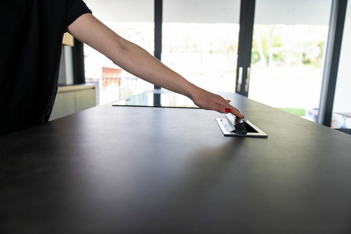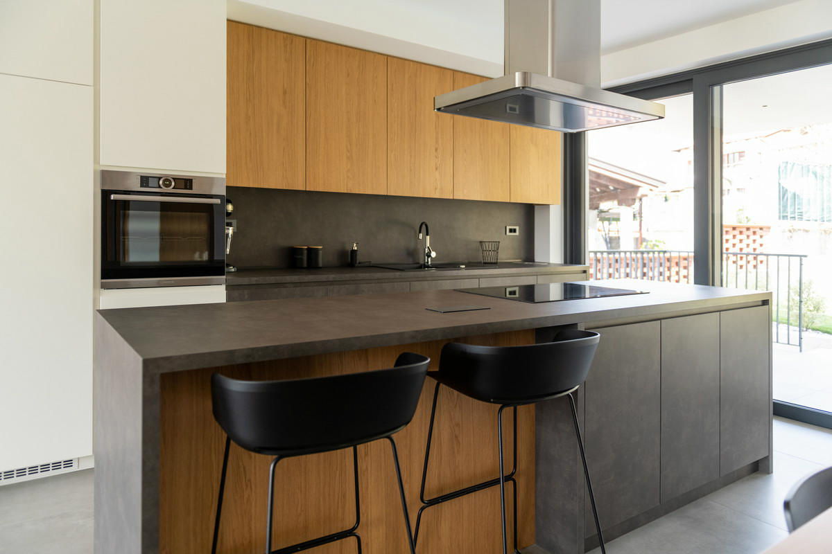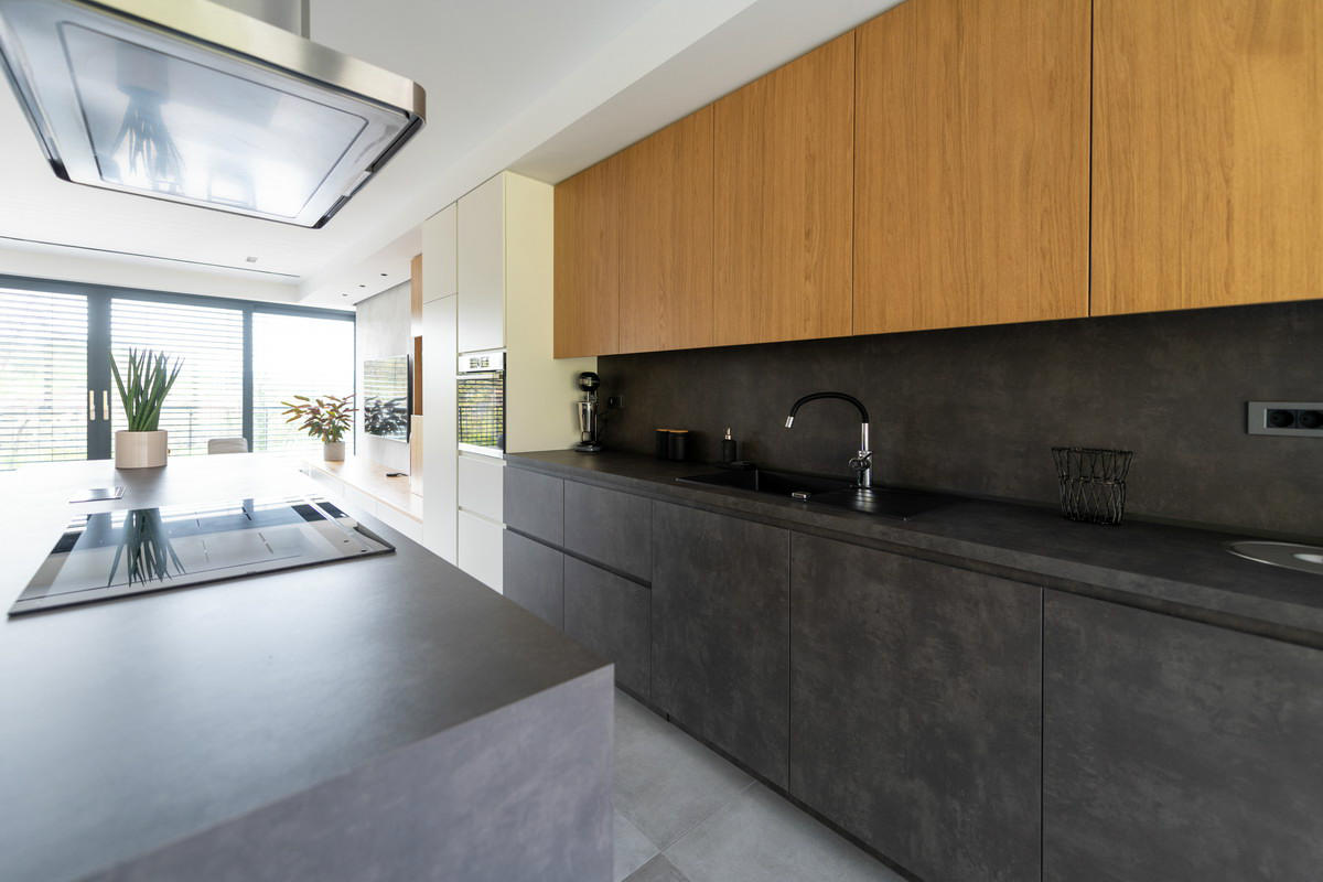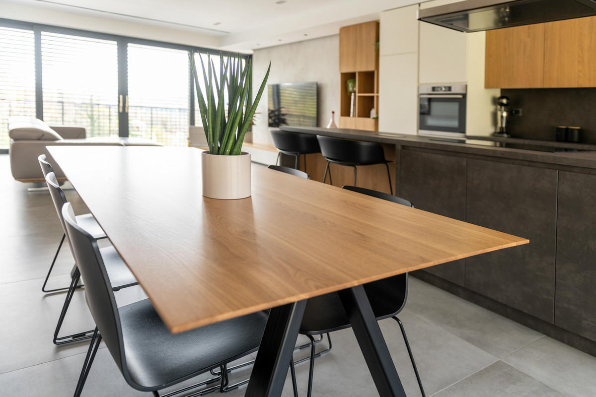 In the kitchen, the combination of dark ultrapas, white-painted MDF and lacquered oak veneer is enriched by the most modern fittings and hidden ways of opening doors and drawers. In the dining room there is a table made of solid oak wood. White and oak are the red thread of all other rooms.
