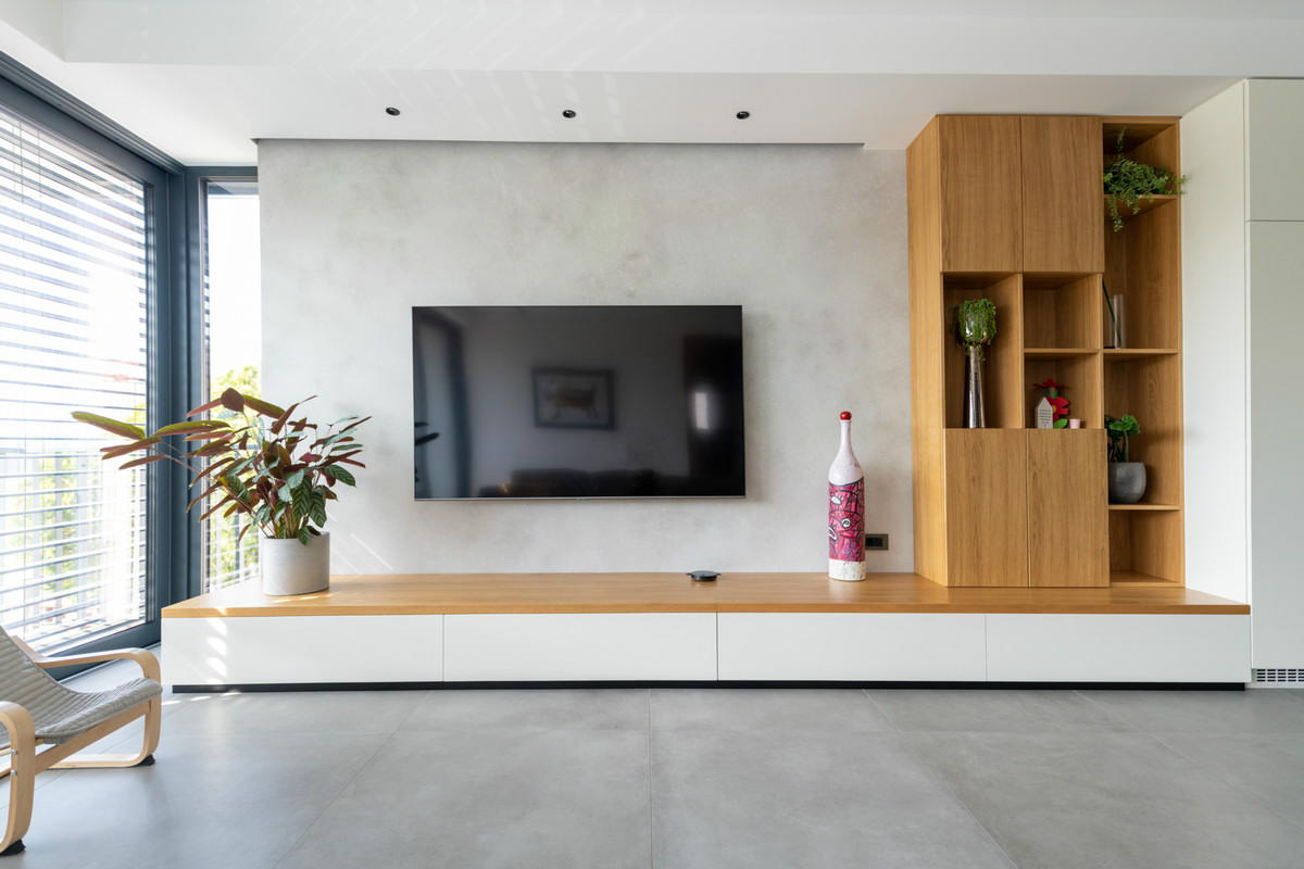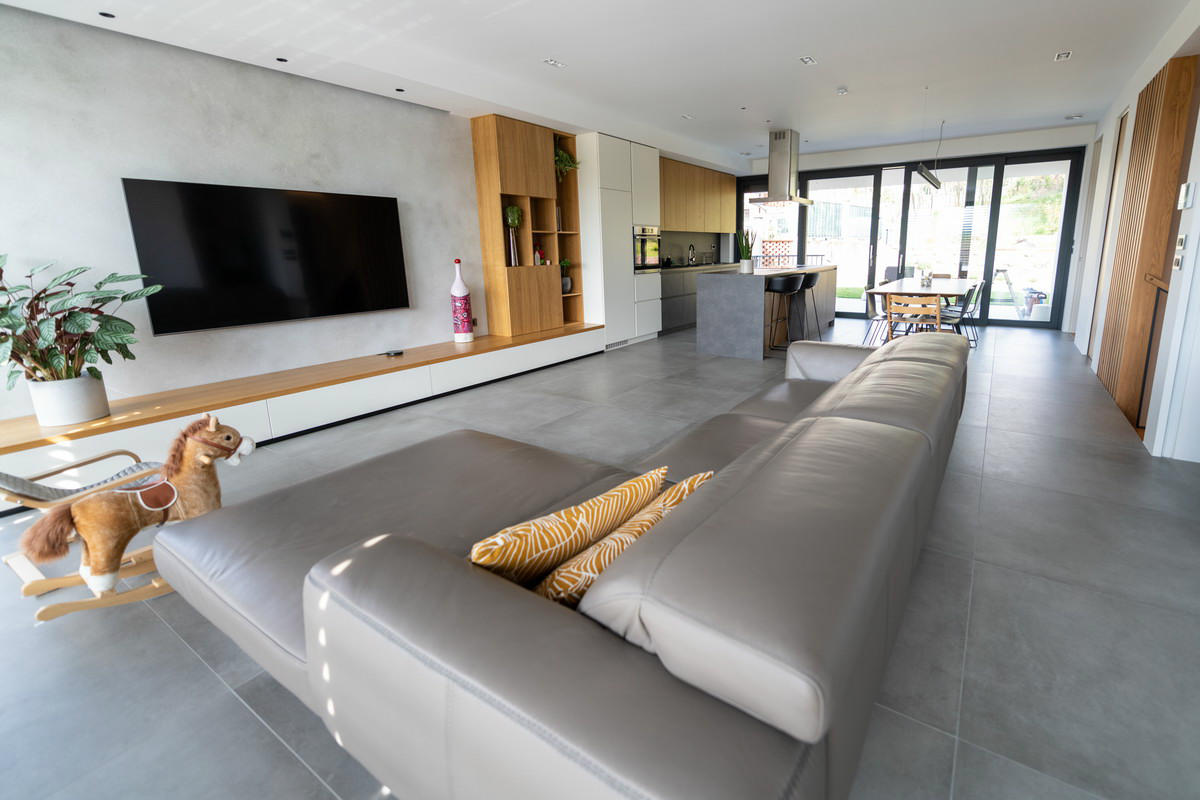 The living room is adorned with a beautiful leather sofa COSMObySOFO and functional furniture, which not only in the living room, but also in the kitchen, bedroom, hallways, and home office provides optimal use of space.