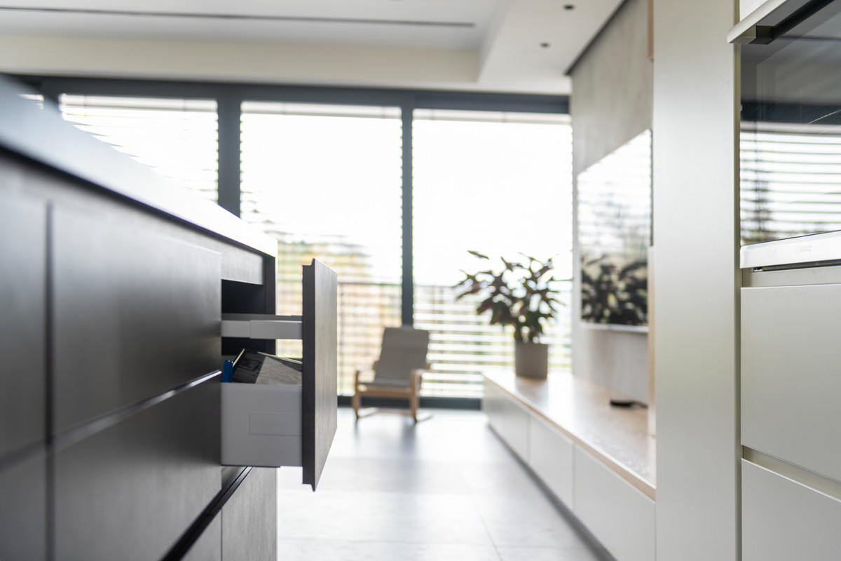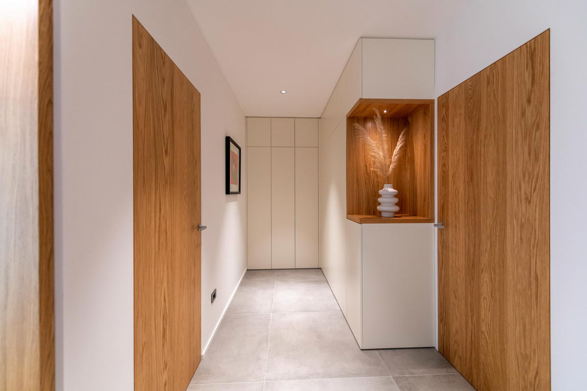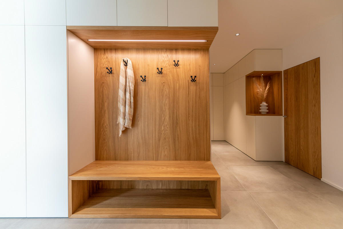 In the kitchen, the combination of dark ultrapas, white-painted MDF and lacquered oak veneer is enriched by the most modern fittings and hidden ways of opening doors and drawers. In the dining room there is a table made of solid oak wood. White and oak are the red thread of all other rooms.