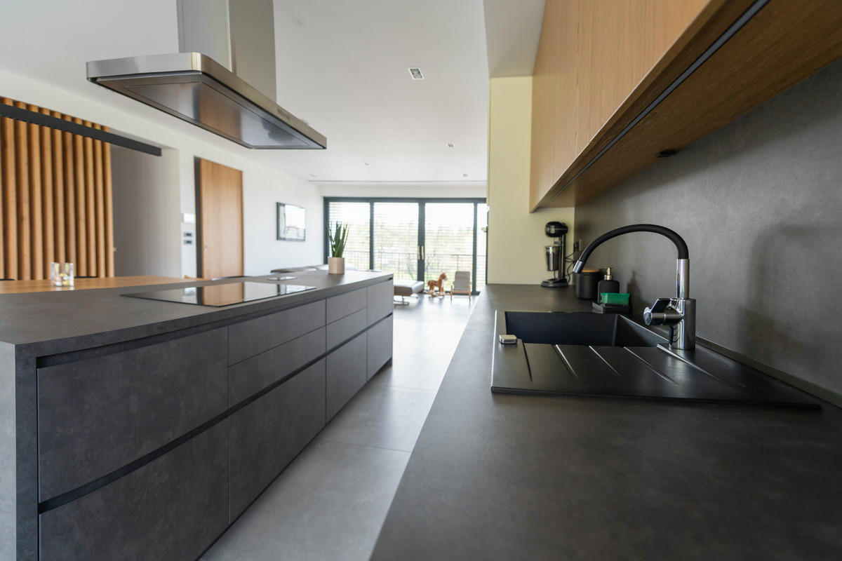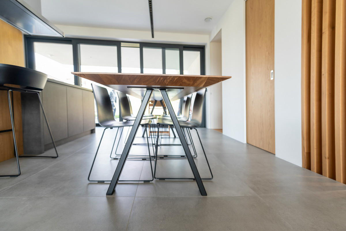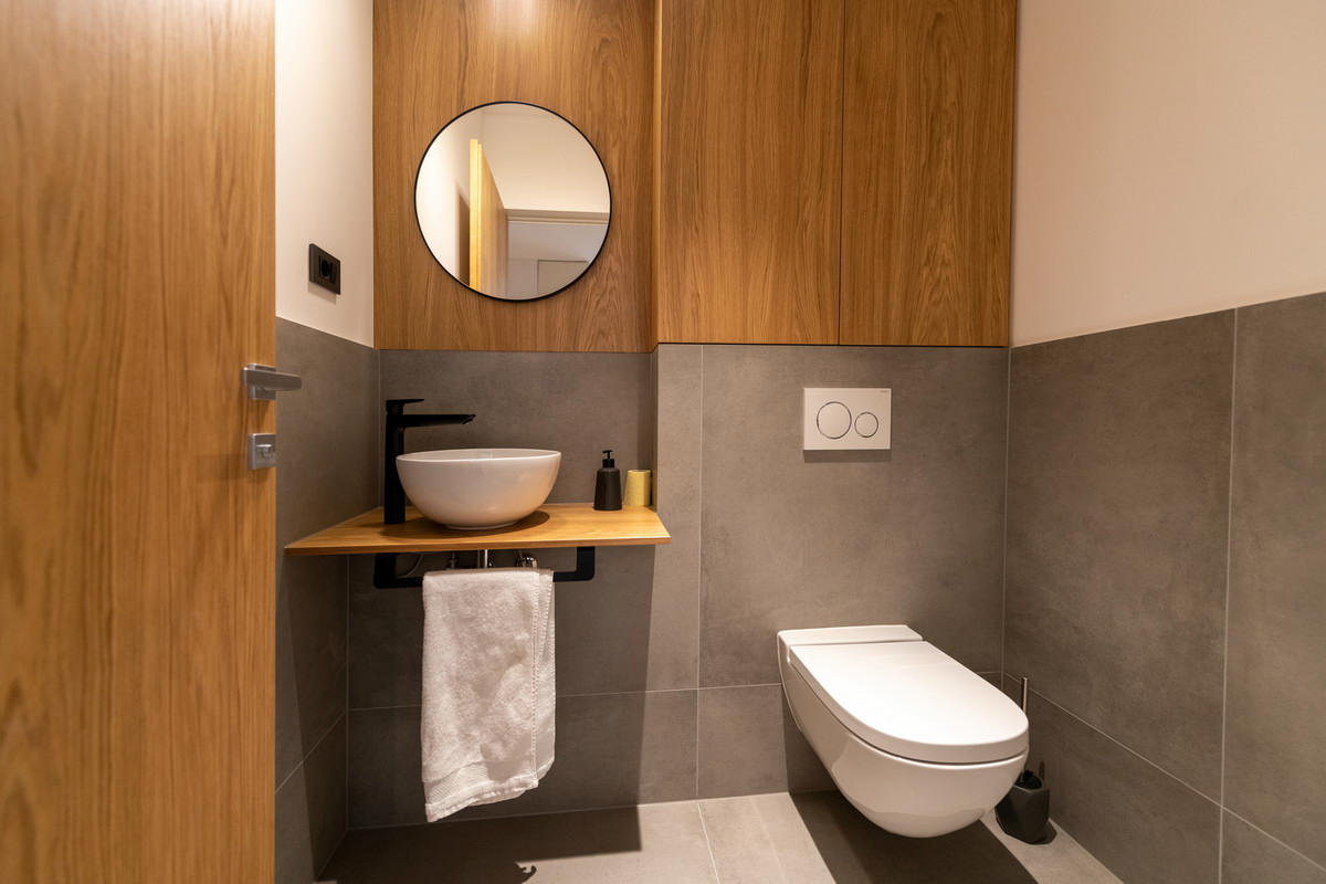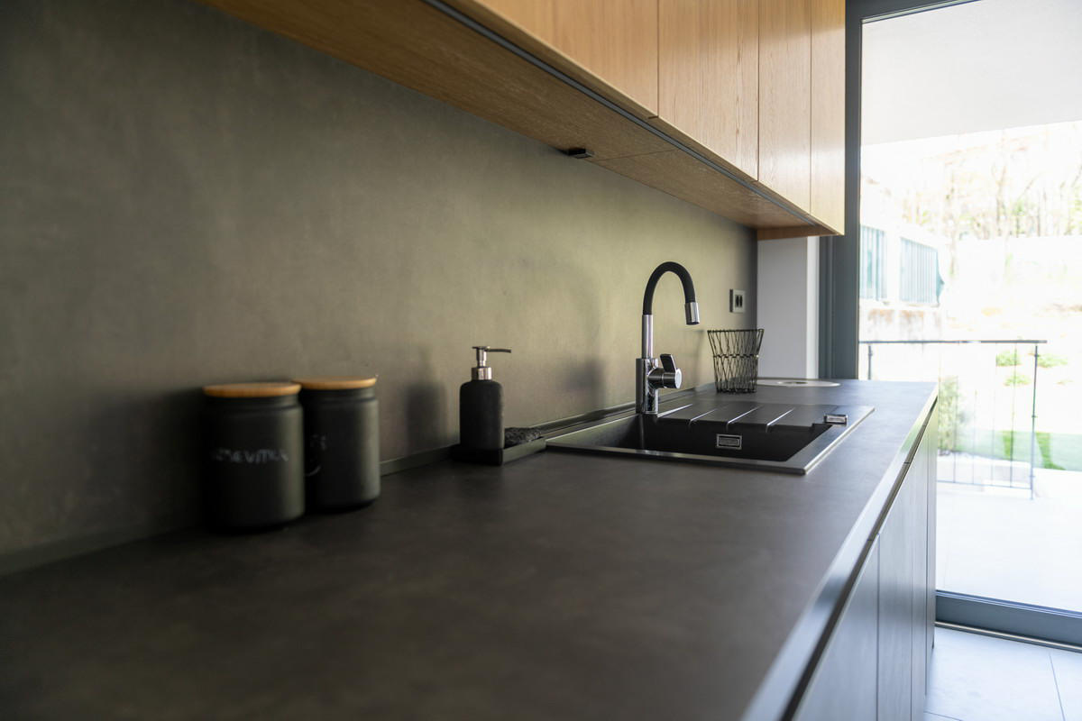 In the kitchen, the combination of dark ultrapas, white-painted MDF and lacquered oak veneer is enriched by the most modern fittings and hidden ways of opening doors and drawers. In the dining room there is a table made of solid oak wood. White and oak are the red thread of all other rooms.