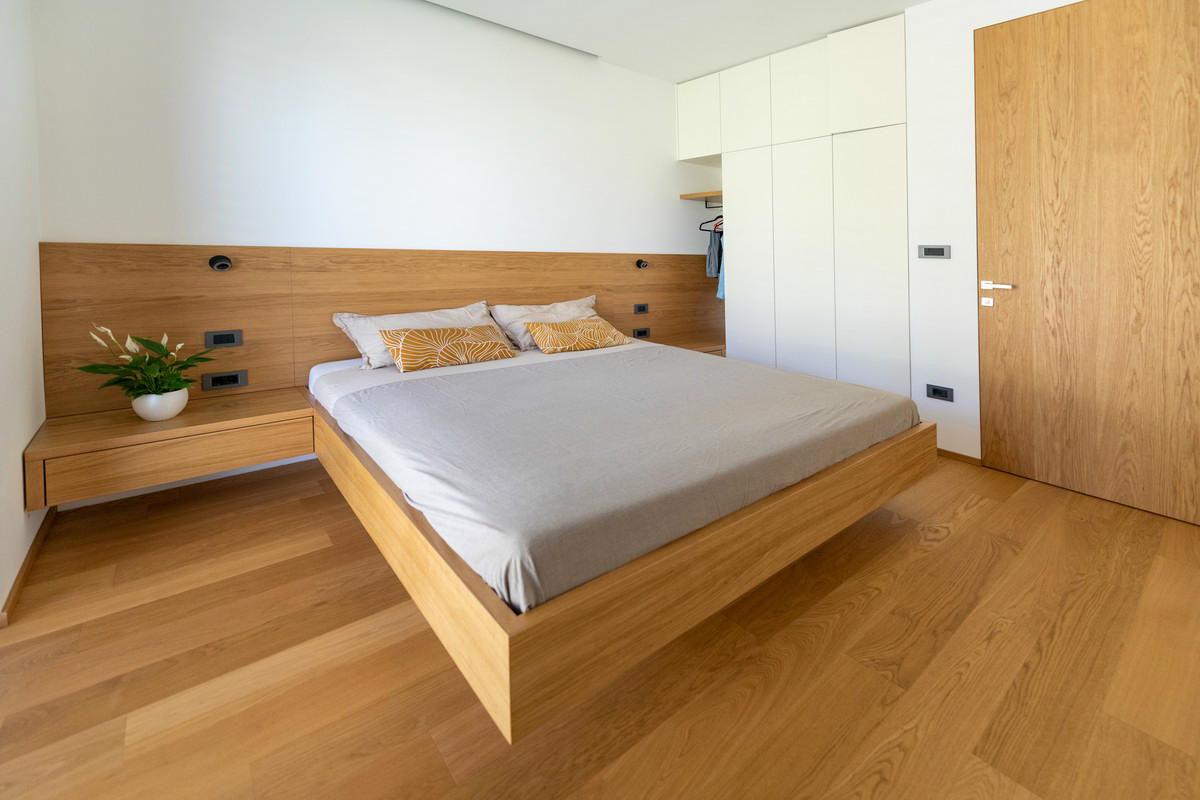 Our company has manufactured and fully equipped a family house with custom-made furniture, characterized by organic colors and the harmony of various textures, shapes and materials. Built-in lighting complements the furniture.