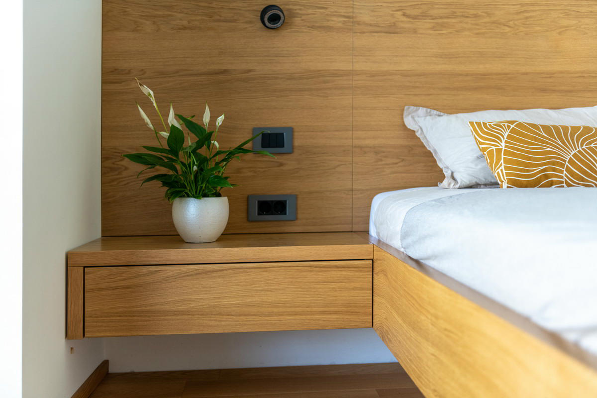 The warmth of wood, white surfaces and Kerrock composite material in the bathrooms create a pleasant and relaxing ambience.